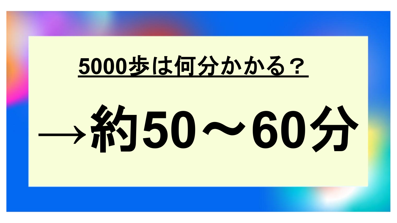 一般的な歩行速度で5000歩を歩く場合、約50~60分程度が目安となります。