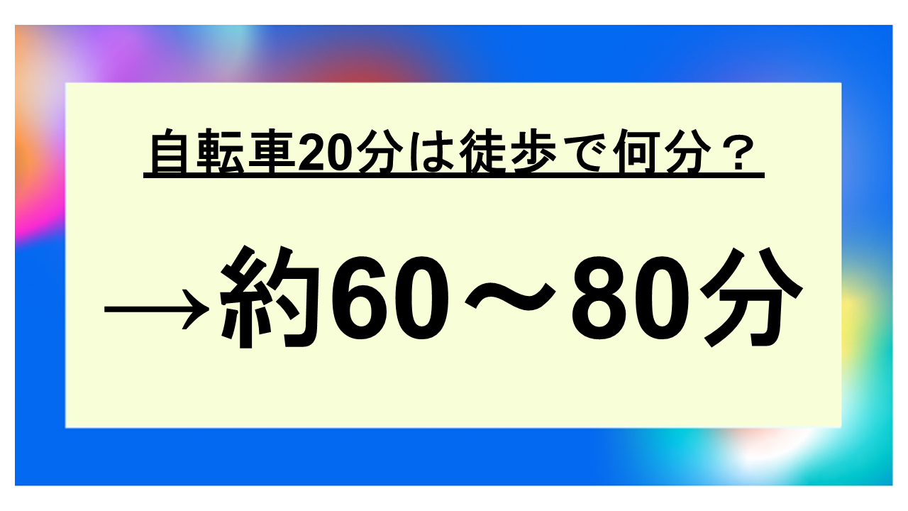 自転車20分の距離を徒歩に換算すると、約60〜80分が目安となります。