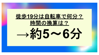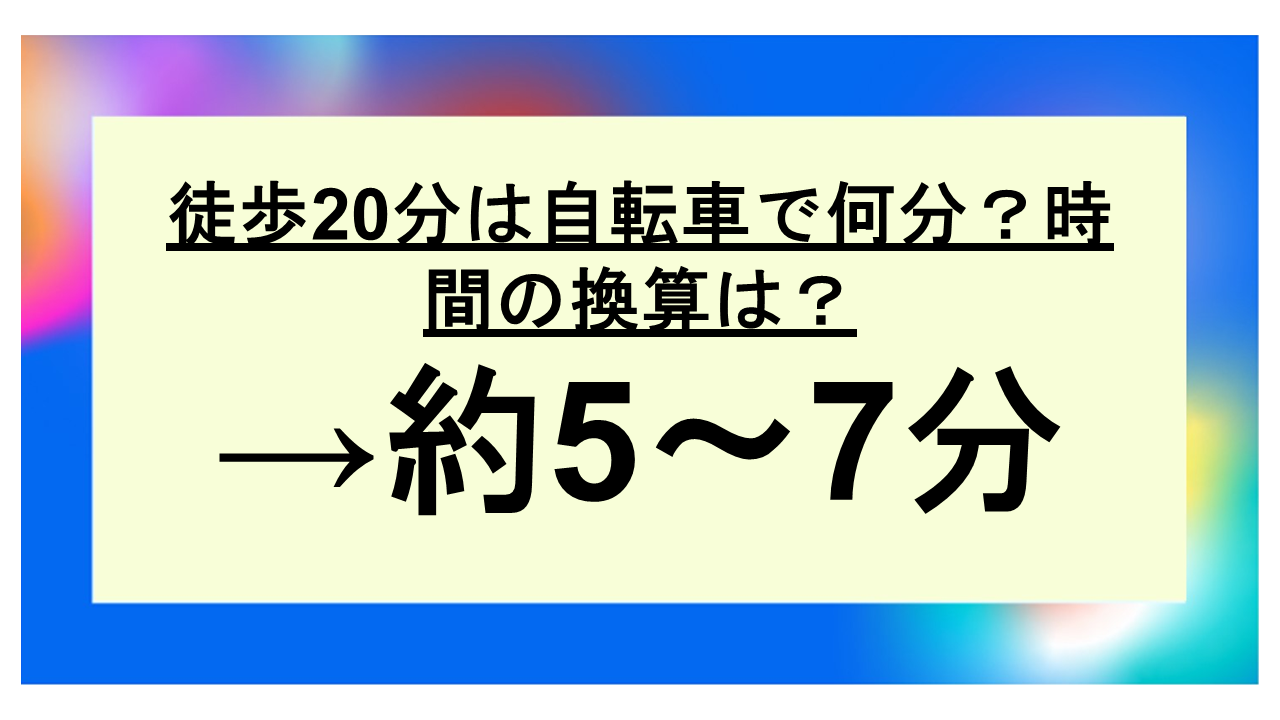徒歩20分は、一般的な速度(徒歩時速4km・自転車時速15km)をもとに換算すると自転車で約5〜7分が目安となります。